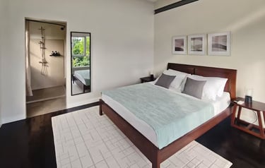 The villa features two large bedrooms — each designed with natural textures, neutral hues, and wooden furnishings.