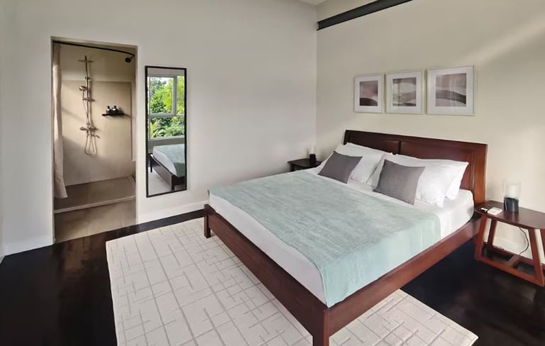 The villa features two large bedrooms — each designed with natural textures, neutral hues, and wooden furnishings.